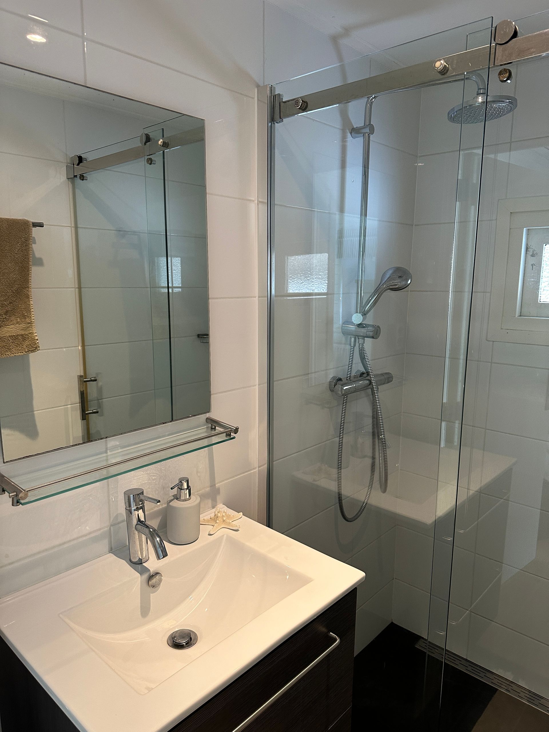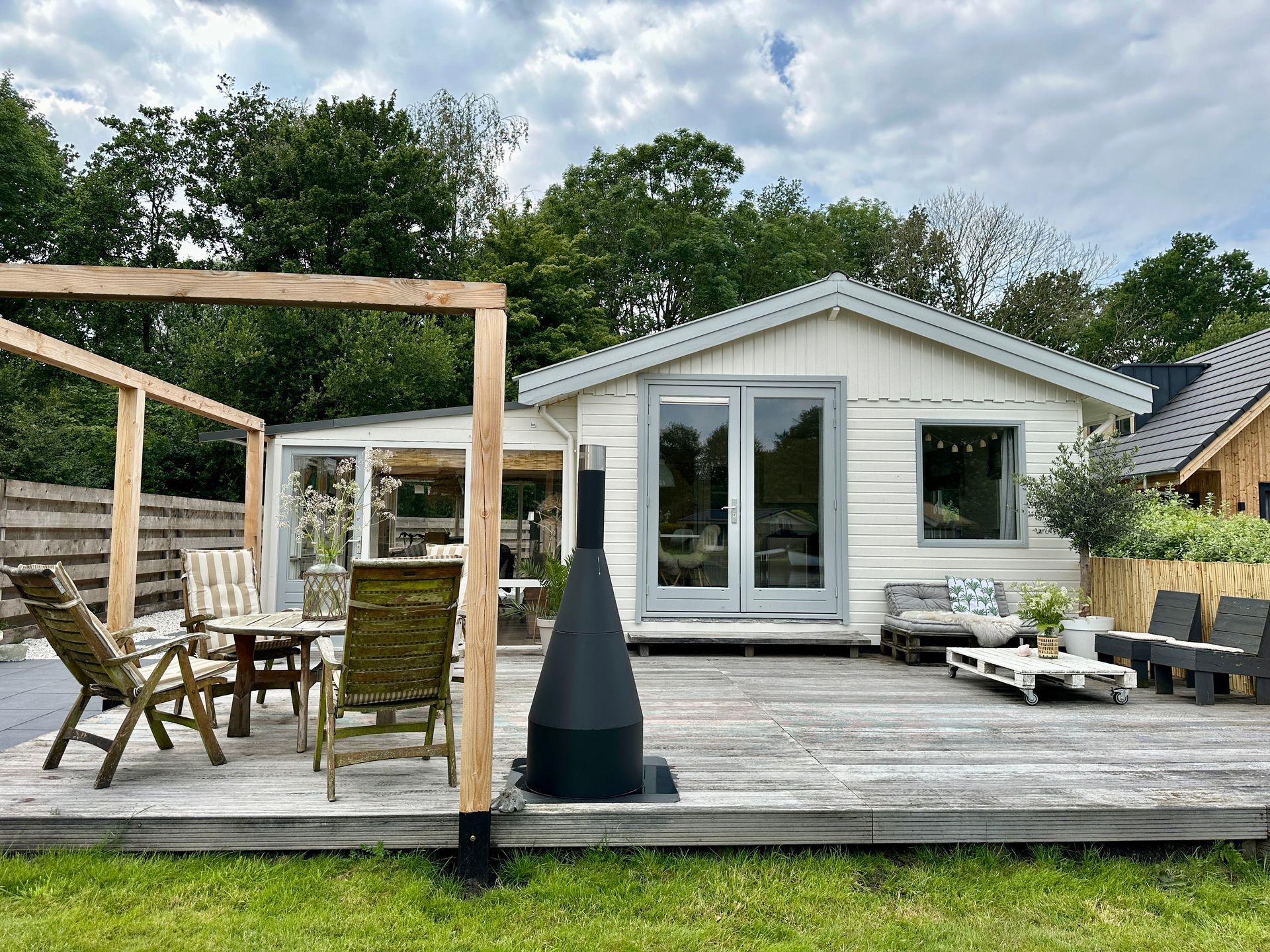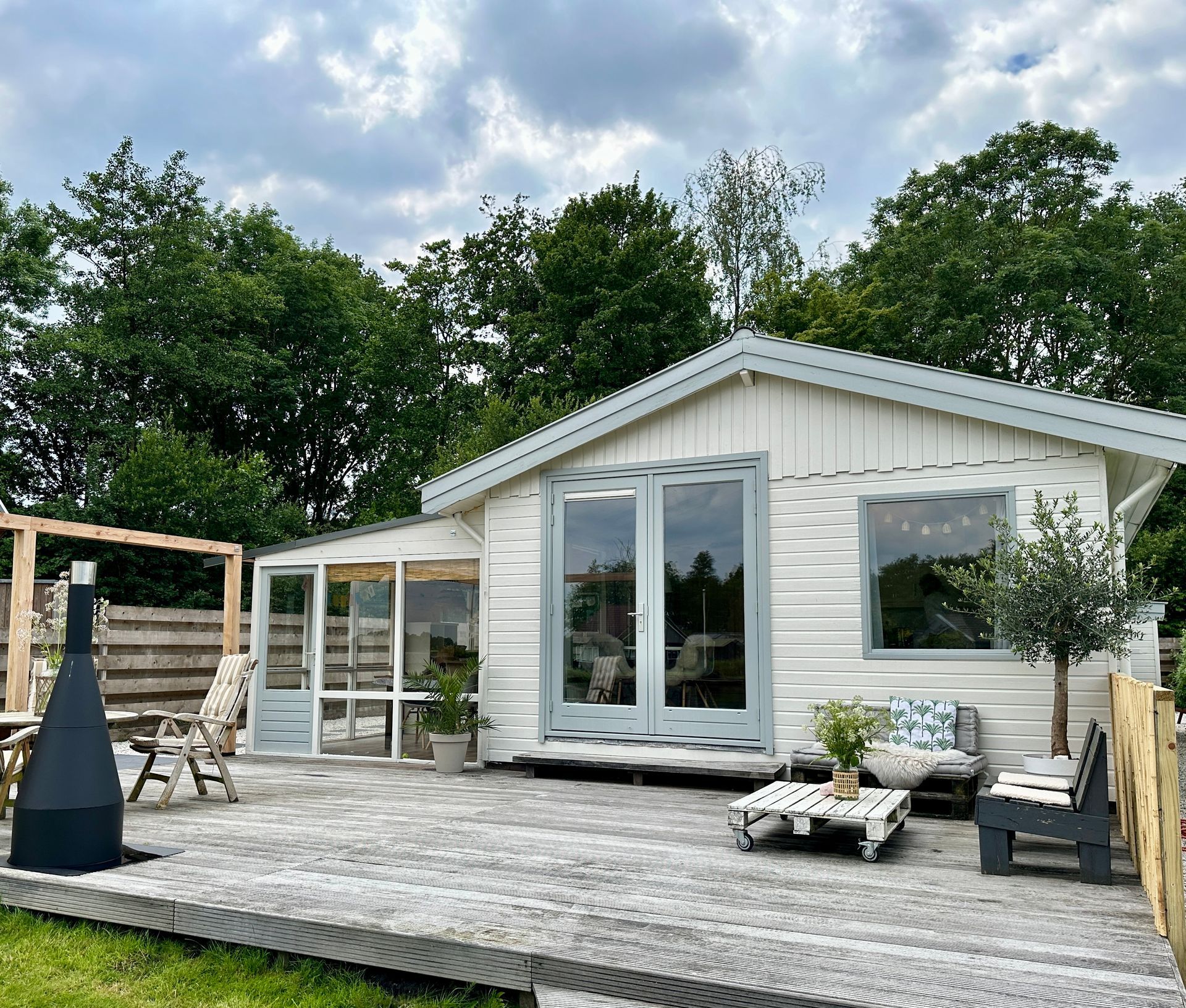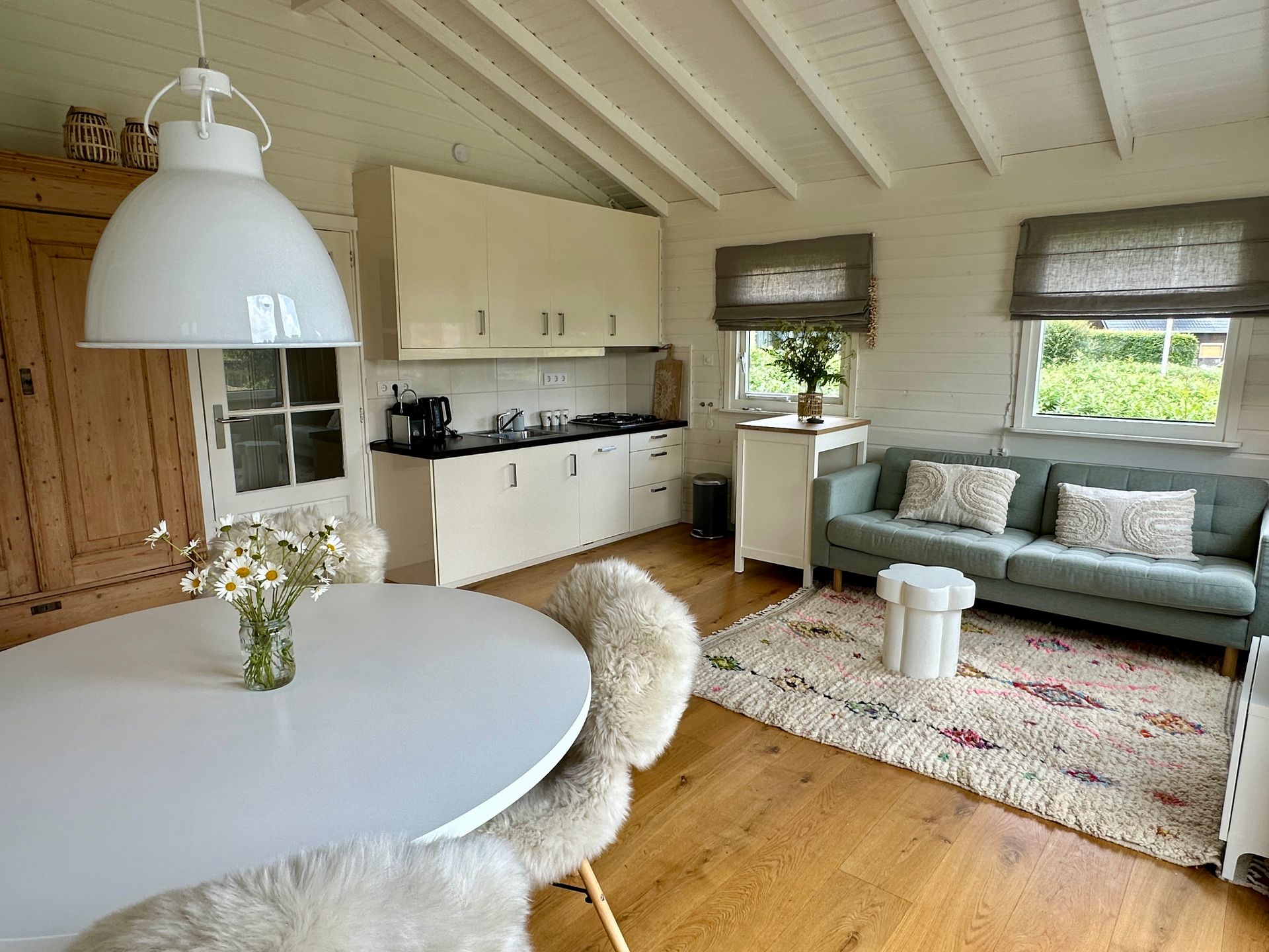 Het meerhuisje heeft een aparte WC en badkamer. De keuken is uitgerust met een waterkoker, tosti ijzer, nespresso apparaat en een oven/magnetron, zo ben je altijd van alle gemakken voorzien. Ook beschikt het meerhuisje over een wasmachine en droger.