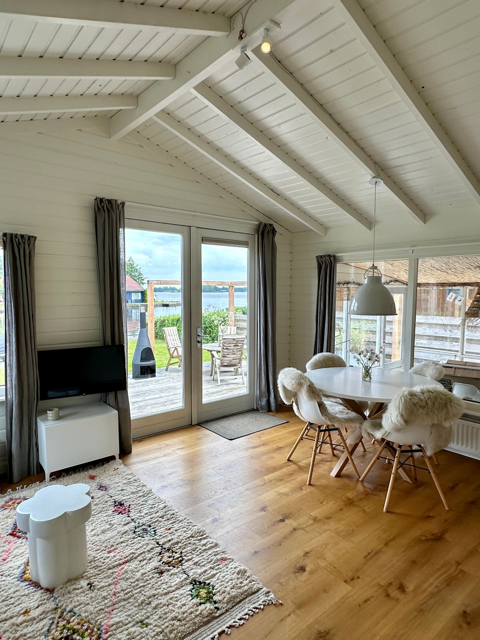 Vanuit de gezellige woon/eetkamer loop je zo het grote buitenterras op waar je heerlijk in het zonnetje kunt genieten van het mooie uitzicht over het meer. Naast de ruimte leef woonkeuken beschikt het meerhuisje over een mooie serre waar je ook kunt zitten en genieten.